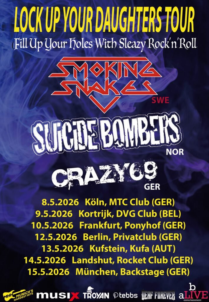 We are thrilled to announce that Smoking Snakes will hit the roads in Germany and Austria in May 2026 together with the great SUiCiDE BOMBERS from Norway and Crazy69 from Munich 💥